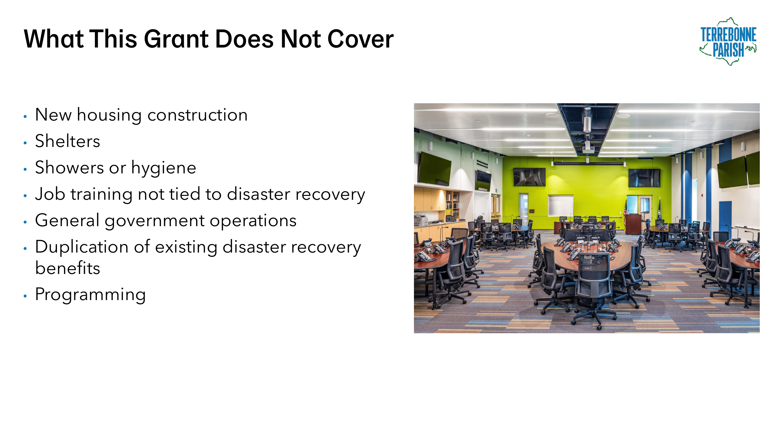 - Recovery update – What has already been done in Terrebonne Parish, and where is the funding coming from?