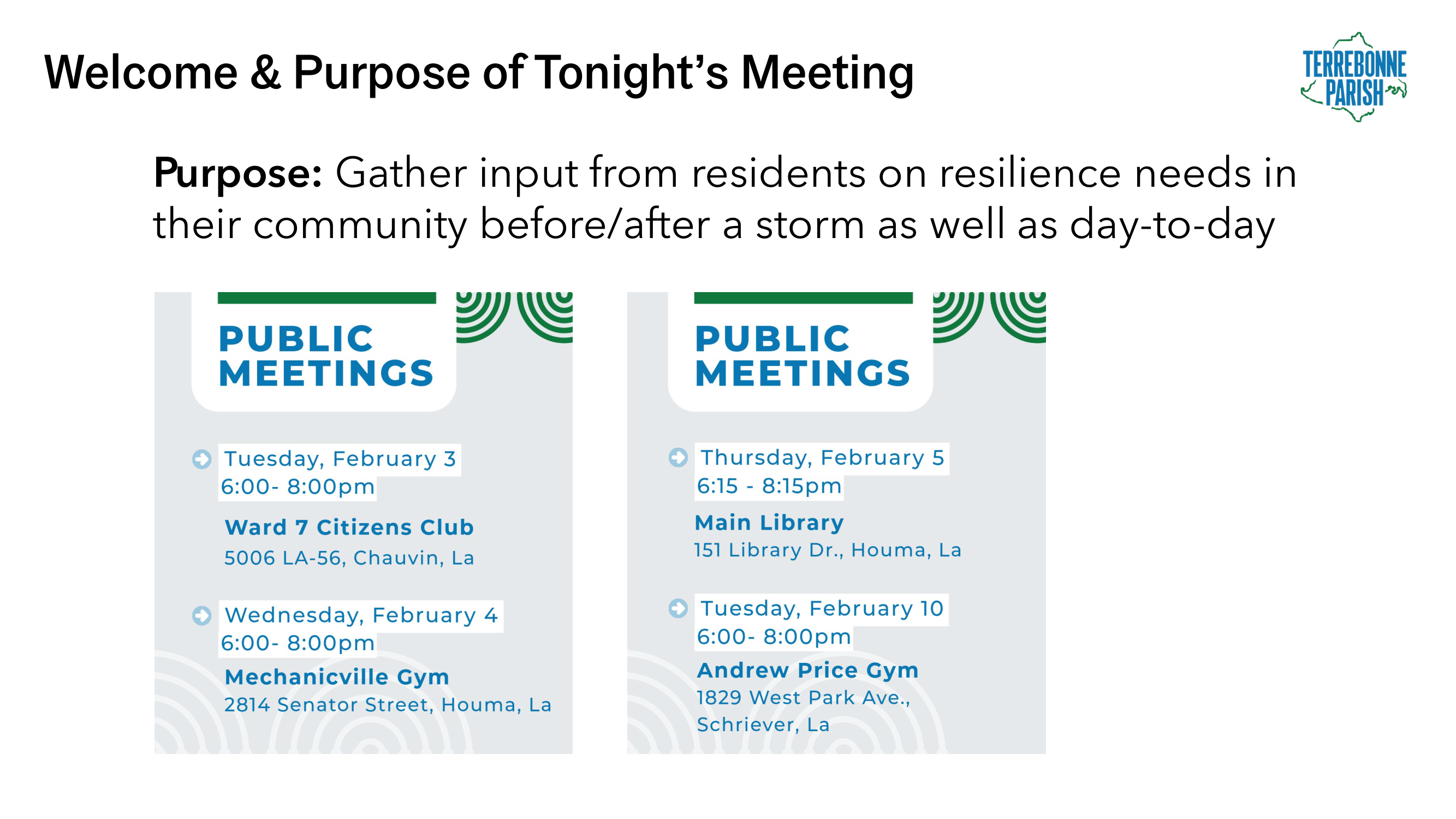 - Long-term plans – How do Hurricane Ida recovery plans align with the Parish’s long-term plans? We’ll discuss our Recovery Plan, Comprehensive Master Plan, Main Street Corridor Master Plan, and the Hazard Mitigation Plan Update.